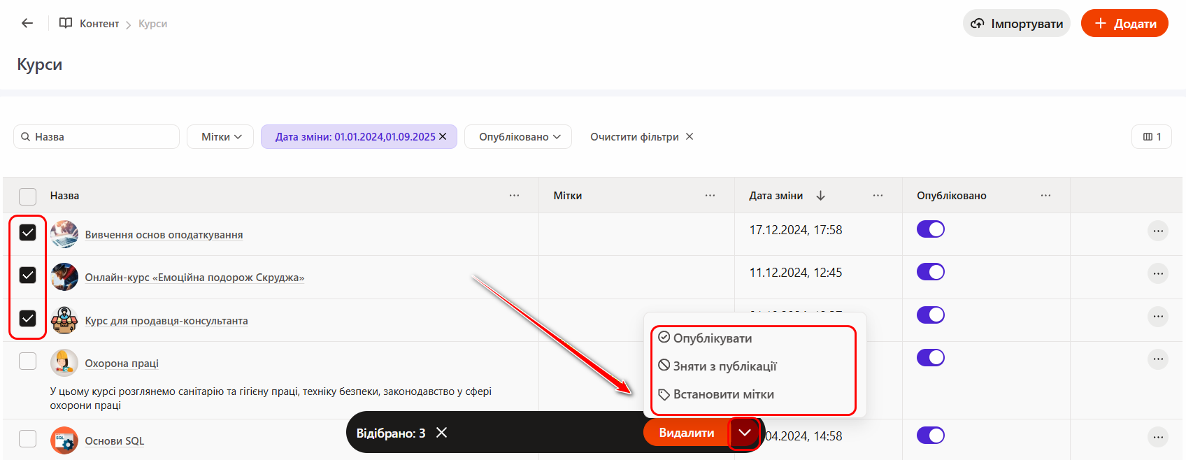 При роботі з Курсами доступна Групова дія. Можна виділити чекбоксами потрібні курси і виконати з ними одну з наступних дій: