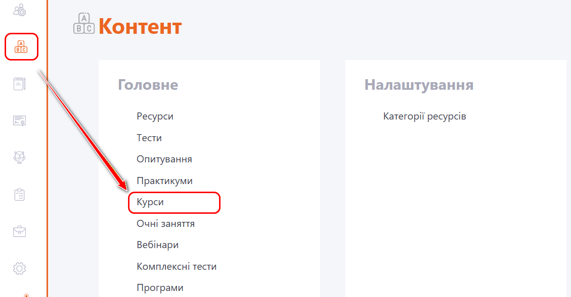 Створення Курсів доступне в меню Контент - Курси: