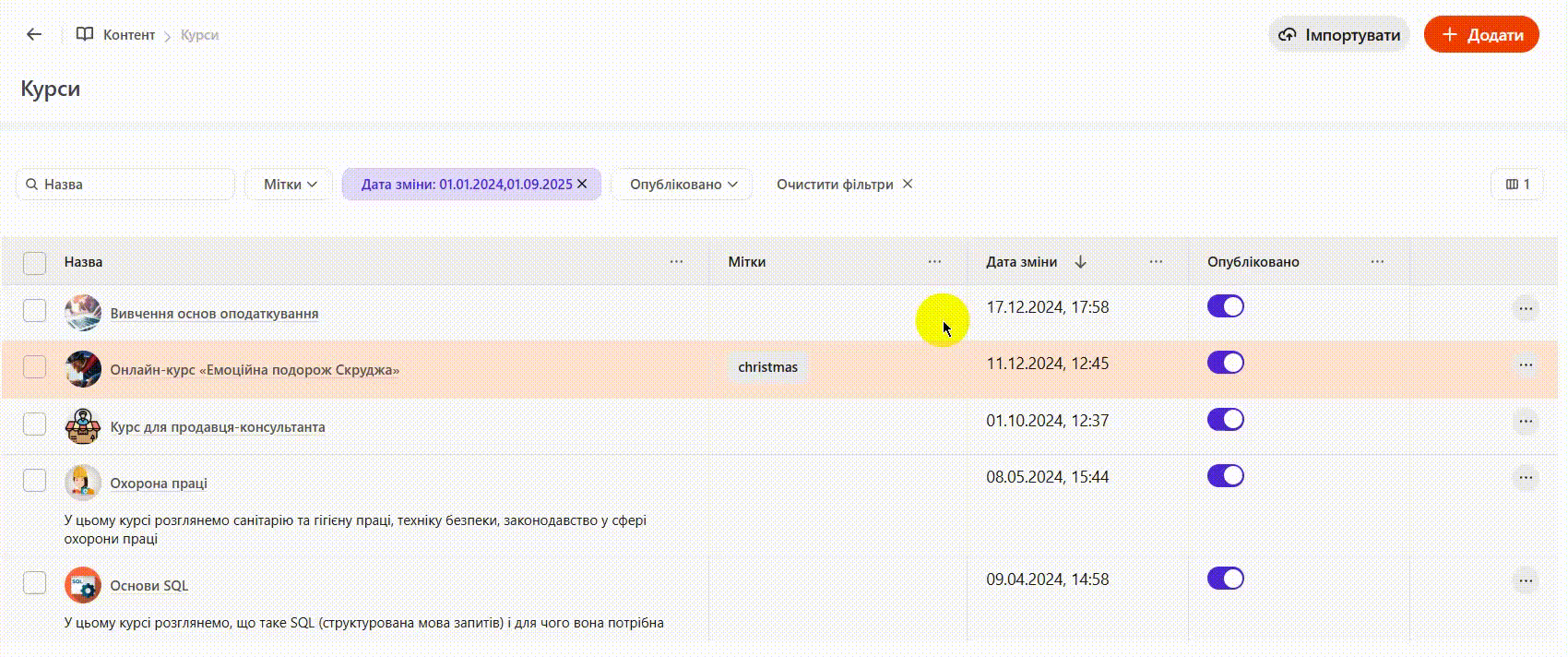 На сторінці Курси відображені всі раніше створені Курси, а також доступні інструменти для створення нових: