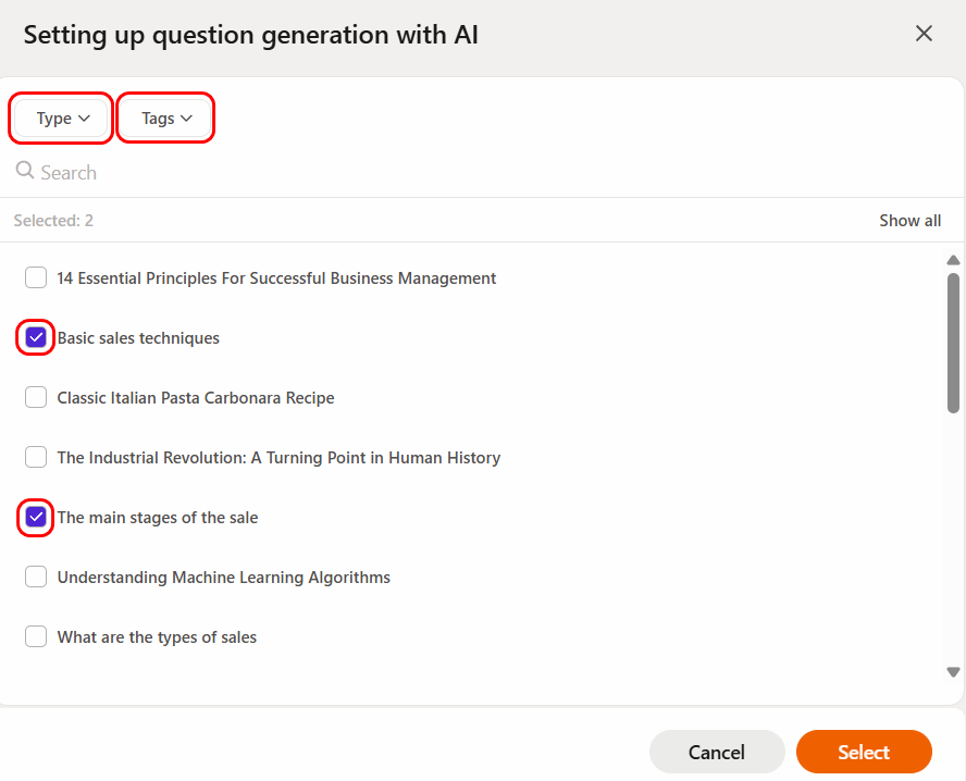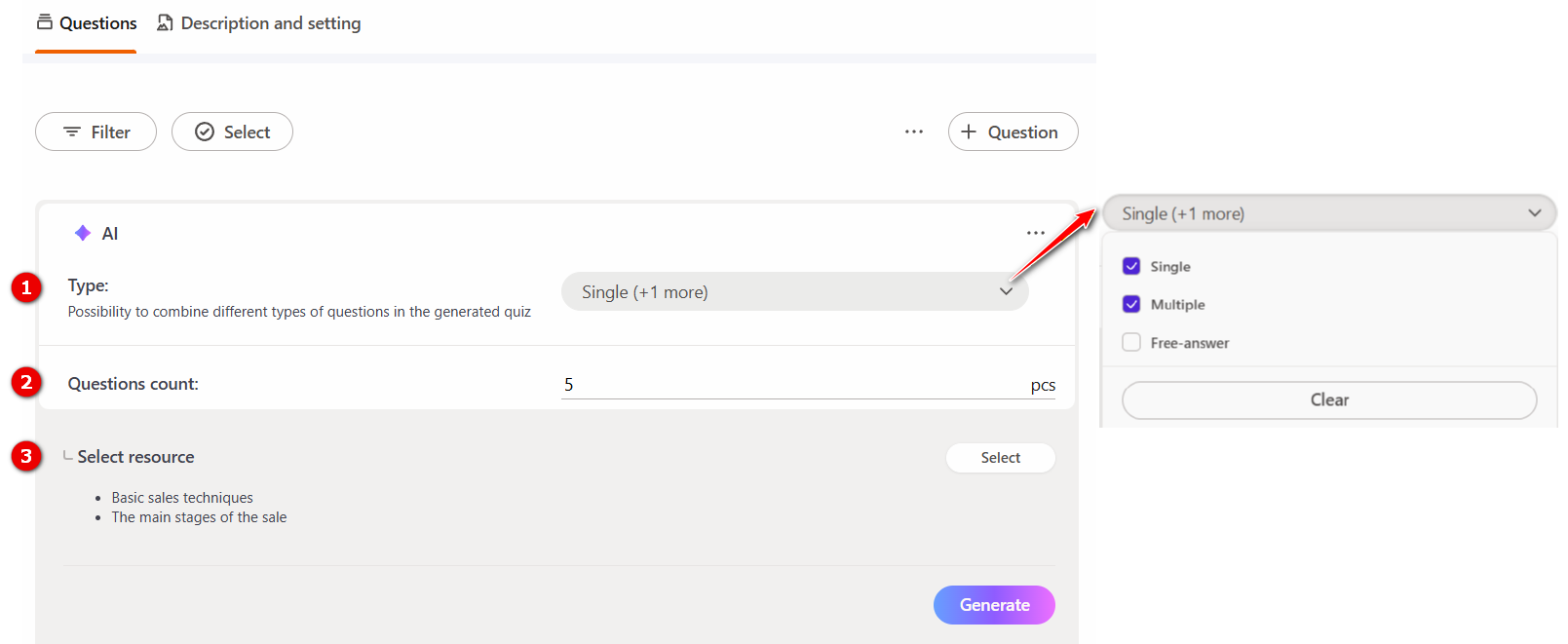 (1) – Question type – in the dropdown menu, select the types of questions to generate. Available options: single-choice questions, multiple-choice questions and free-answer questions. You can select one type or multiple types at the same time.