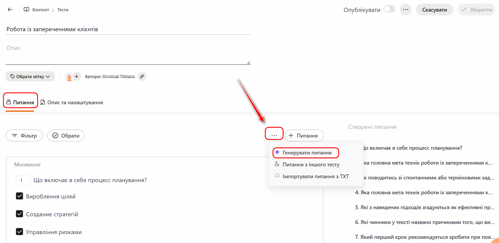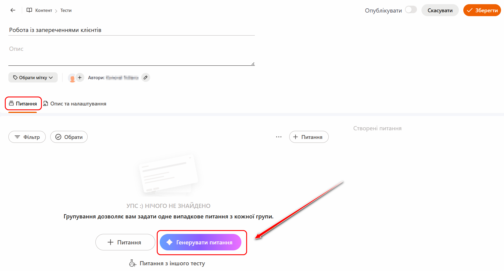 Для створення питань в тесті за допомогою ШІ на сторінці створення тестів у вкладці Питання необхідно натиснути кнопку Генерувати питання