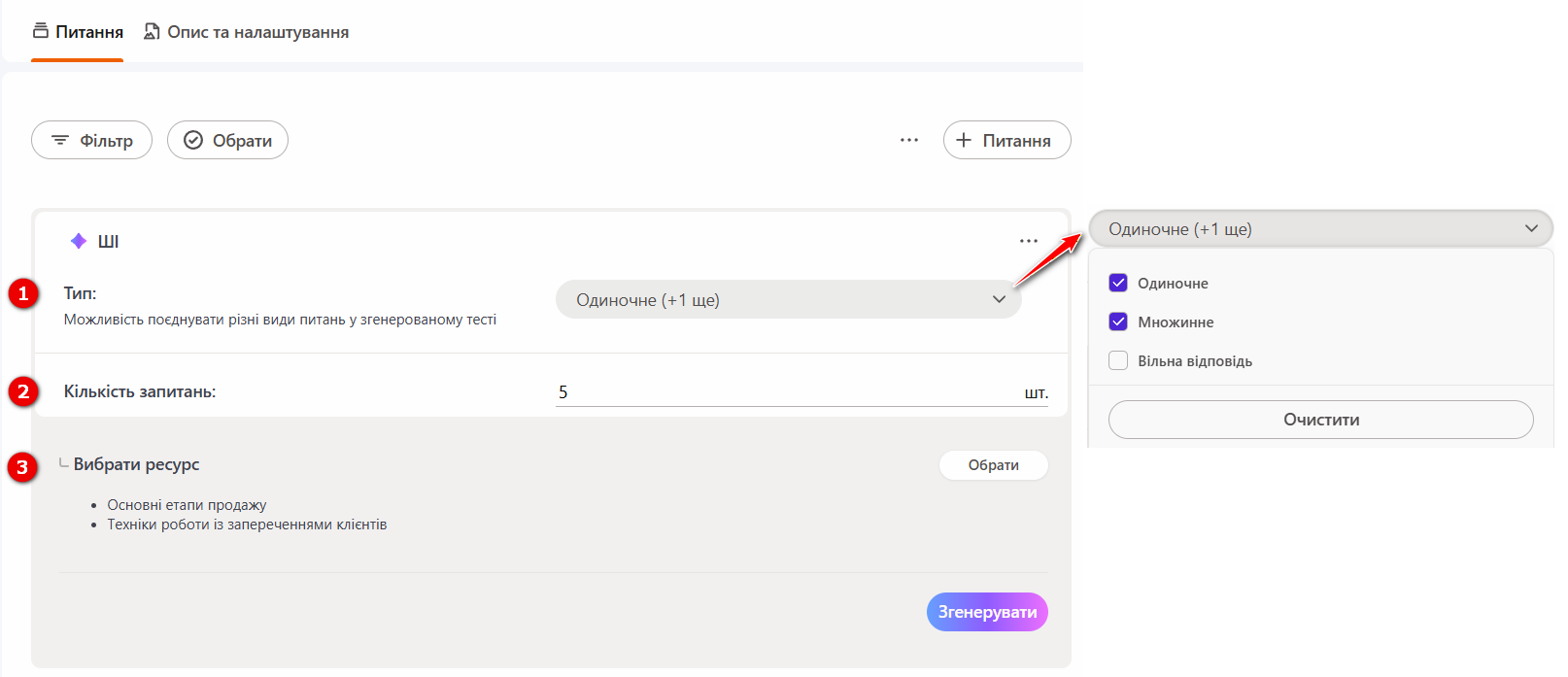 (1) - Тип питань - у випадаючому списку оберіть типи питань, які потрібно згенерувати. Доступні варіанти: питання з однією правильною відповіддю, питання з множинним вибором і питання з вільною відповіддю. Можна обрати як один тип, так і кілька одночасно.