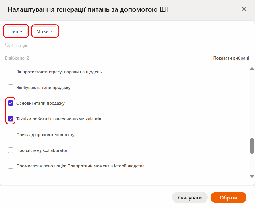 (3) - Вибрати ресурс - оберіть один або кілька ресурсів, на основі яких буде створено питання. Для цього натисніть кнопку «Обрати».