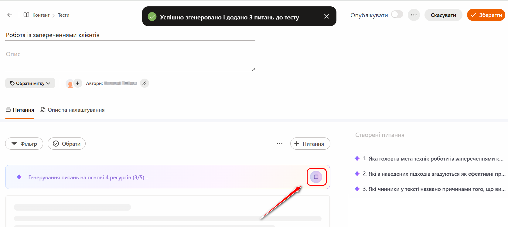 Процес генерації питань відображатиметься на сторінці: під час створення кожного нового питання система показує інформаційне повідомлення, а самі питання додаються до переліку Створені питання з відповідною позначкою.