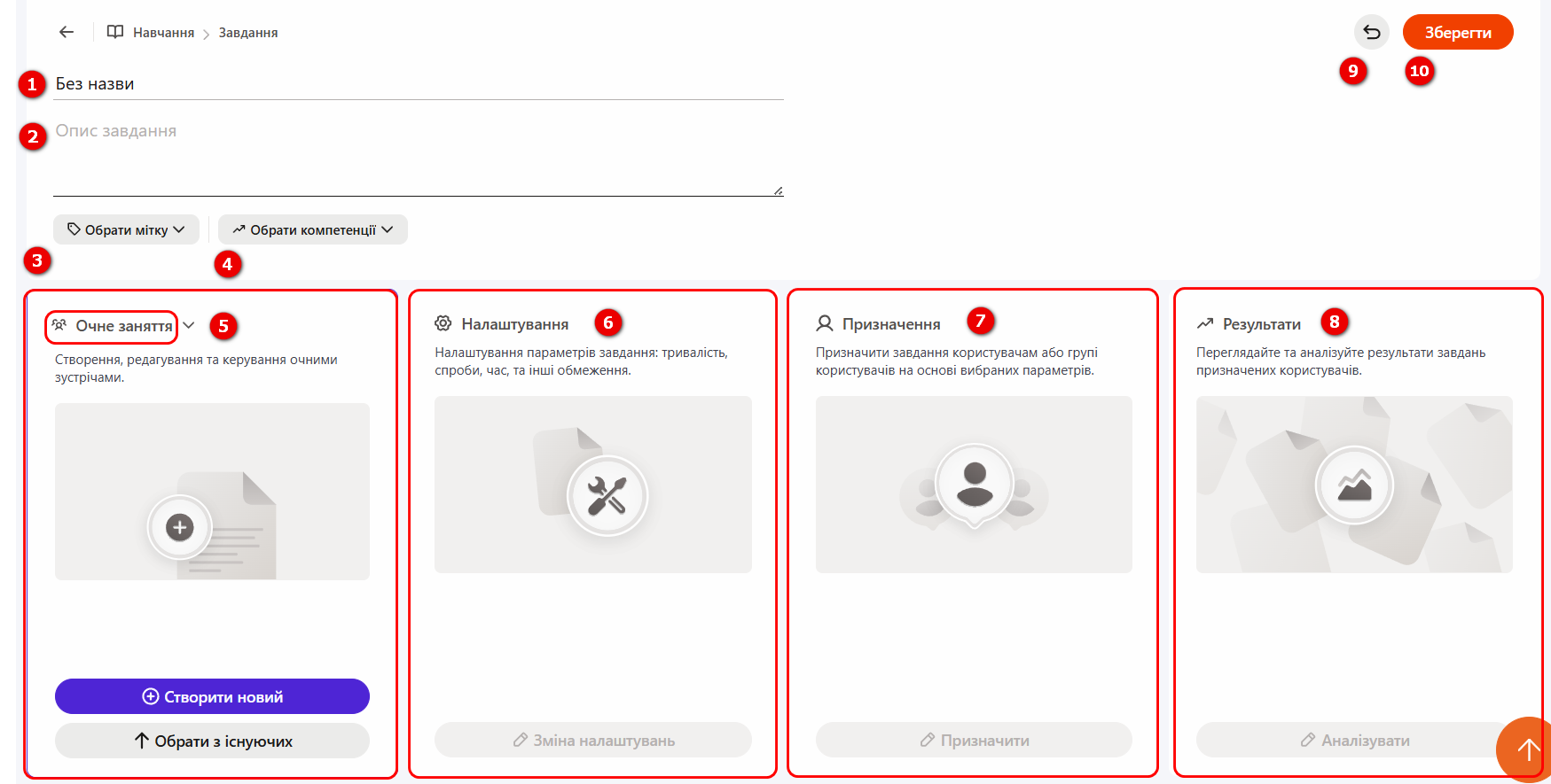 (4) - Обрати компетенції - за необхідності зазначити компетенції, які розвиває Очне заняття. Детальніше: Використання компетенцій у завданнях.