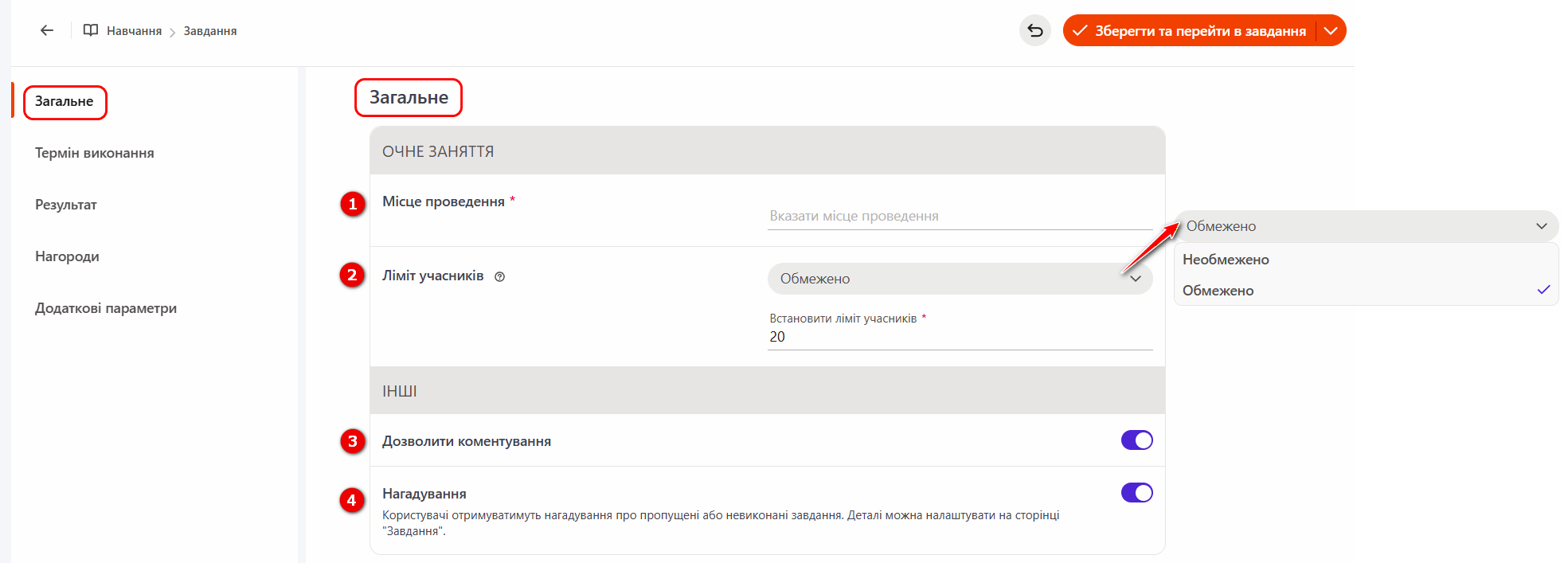 (3) - Дозволити коментування - можливість для Користувача залишати коментарі до завдання. При ввімкнені цього налаштування Користувачі зможуть надати зворотню відповідь про проходження очного заняття чи поставити запитання. Докладніше: Коментарі в завданнях.