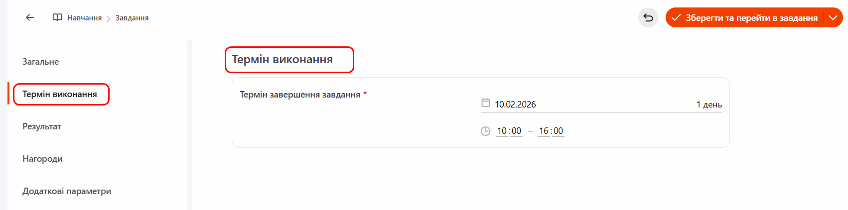 Термін завершення завдання - обов'язкове поле - необхідно вказати календарні дати та час, коли буде проходити дане Очне заняття.