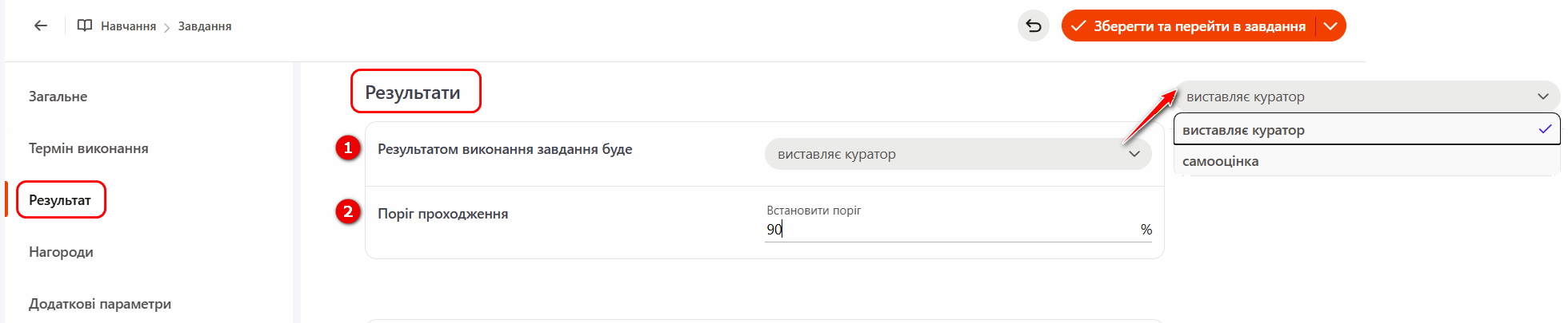 (1) - Результатом виконання завдання буде - вибір способу оцінки завдання - виставляє куратор чи самооцінка. Якщо в завданні обрано спосіб оцінки куратором, обов'язково потрібно призначити куратора на це завдання на етапі призначення користувачів. Детальніше в статті Призначення на очне завдання.