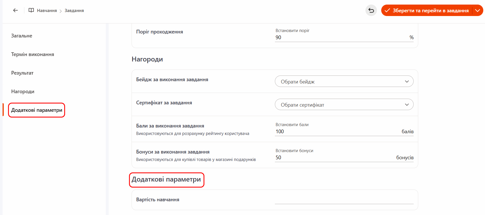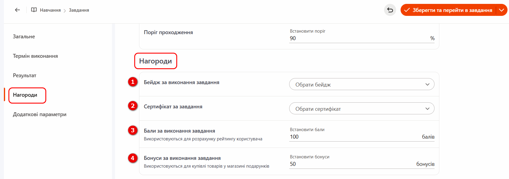 (2) - Поріг проходження - визначає, який відсоток виконання завдання повинен бути достатнім, щоб проходження завдання вважалося успішним.