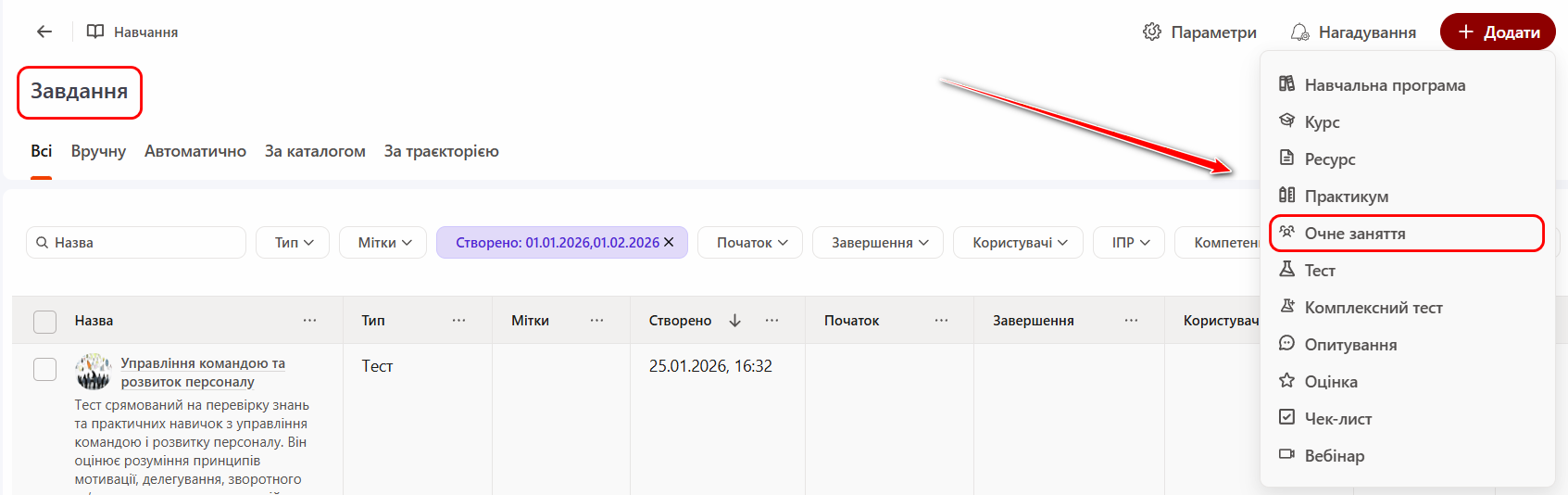 Для створення нового завдання - Очне заняття необхідно перейти в меню Навчання - Управління навчанням - Завдання: