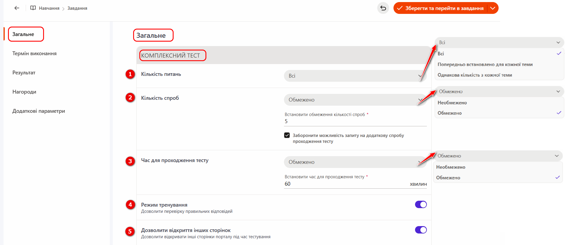 При натисканні кнопки «Зміна налаштувань» відкривається меню з параметрами налаштування Завдання - Комплексний тест.