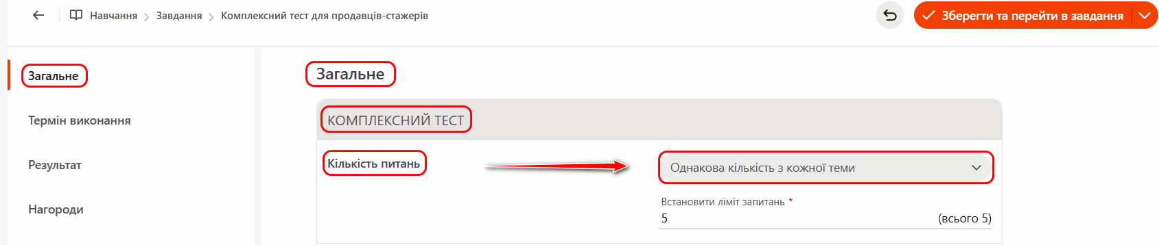 (4) - Обрати компетенції - за необхідності зазначити компетенції, які розвиває комплексний тест. Детальніше: Використання компетенцій у завданнях.