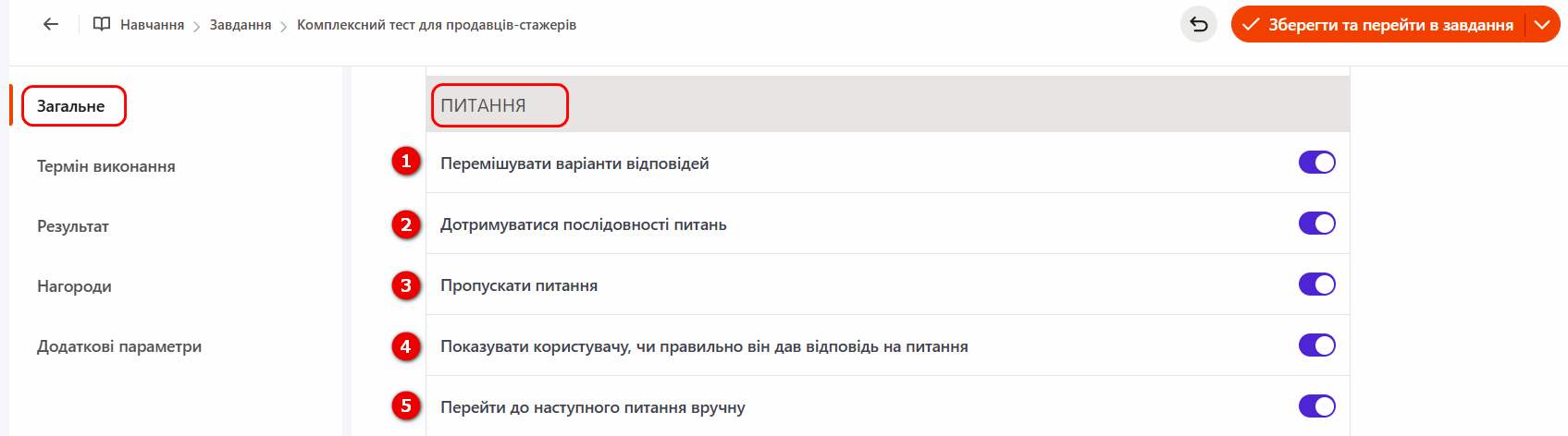 (5) - Перейти до наступного питання вручну - налаштування доступне при виборі опції Показувати користувачу, чи правильно він дав відповідь на питання (4) - для переходу до наступного питання тесту користувачеві необхідно натиснути кнопку "Наступне питання".