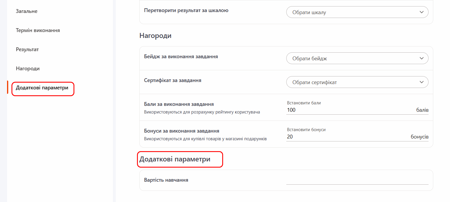 (3) - Бали за виконання завдання - вказати кількість балів за виконання завдання, які використовуються для розрахунку рейтинга користувача (докладніше Бали за виконання завдання);
