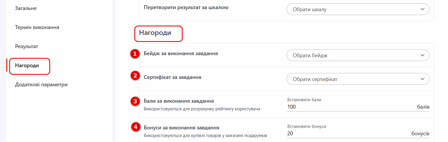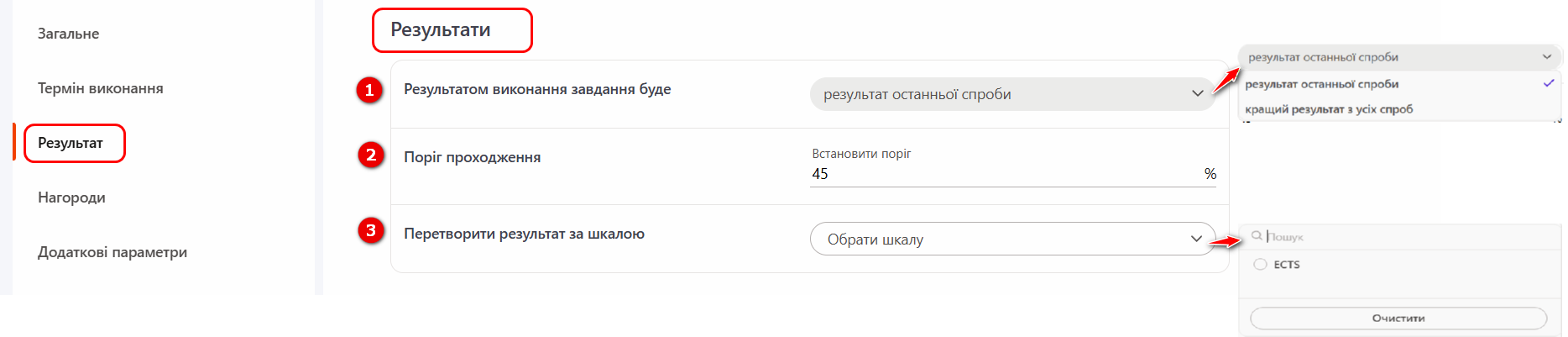 (3) - Перетворити результат за шкалою - можливість налаштувати перерахунок оцінки в % до потрібної шкали (наприклад, 5-бальна система, ECTS і т.д.). За замовчуванням усі завдання у системі оцінюються від 0 до 100%. Детальніше: Шкали оцінки завдань.