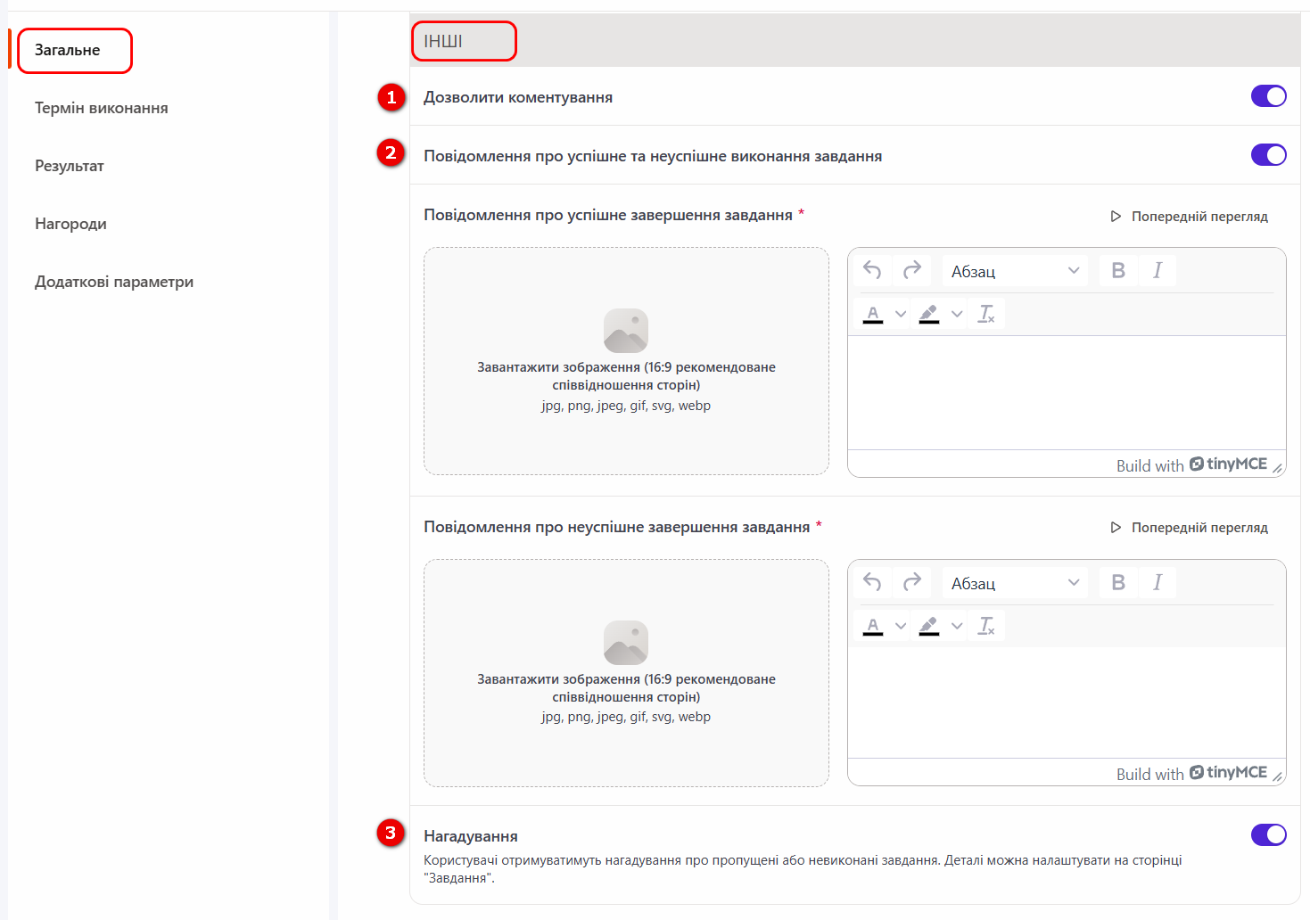 (2) - Повідомлення про успішне та неуспішне виконання завдання - можливість створити в редакторі власне повідомлення про успішне та неуспішне виконання завдання, а також додати зображення чи посилання до нього;