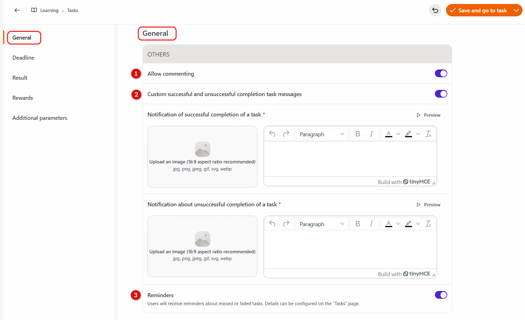 (2) - Custom successful and unsuccessful completion task messages - allows you to create a custom message in the editor for successful or unsuccessful task completion, and also add an image or link to it;
