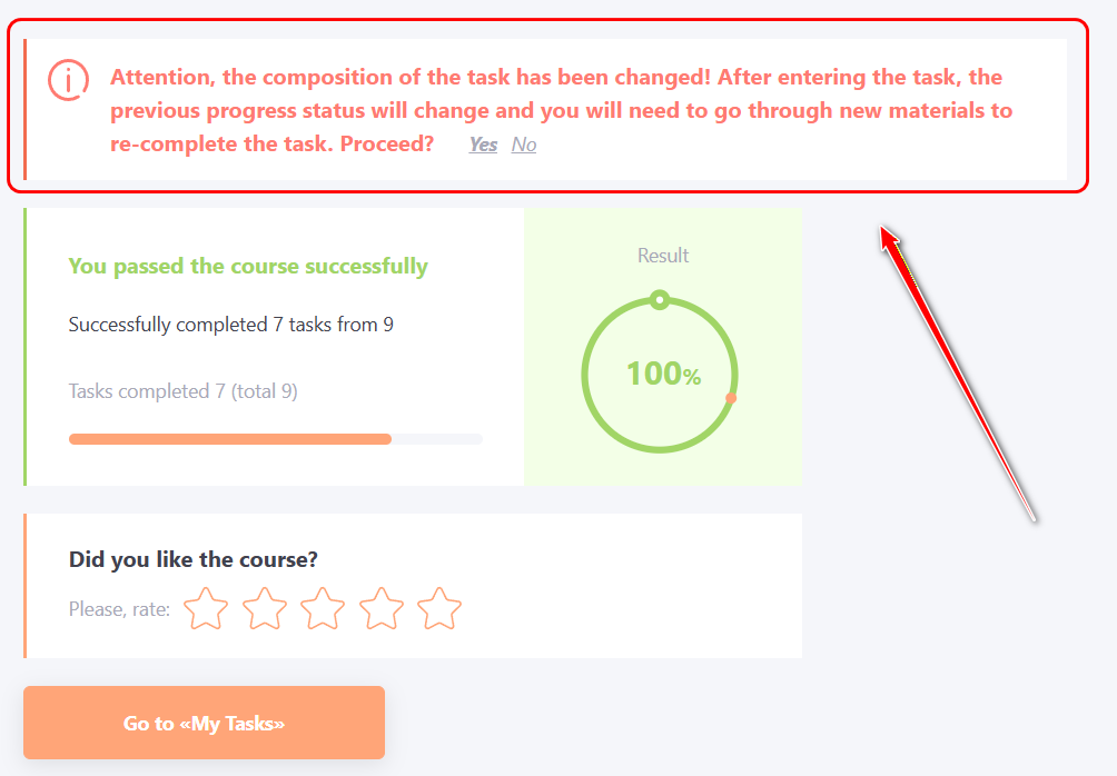 If the course structure has been changed and a user decides to retake it, the system will notify them that upon re-entering the assignment, the completion status will change, and the new materials must be completed in order to receive the "Completed" status.