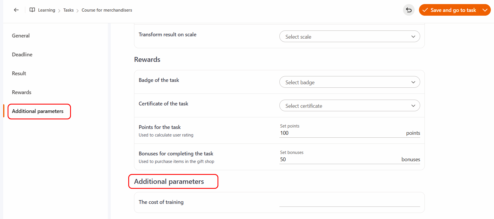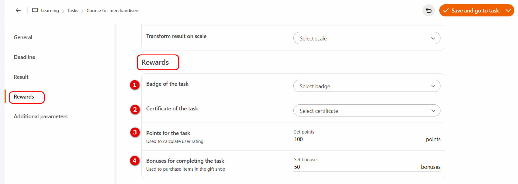 (4) - Bonuses for completing the task - specify the number of bonuses awarded for successful task completion, which can be used to purchase items in the gift shop. More details: Internal currency.