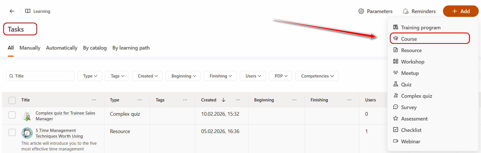 On the Tasks page click the Add button and select the Course task type from the drop-down list: