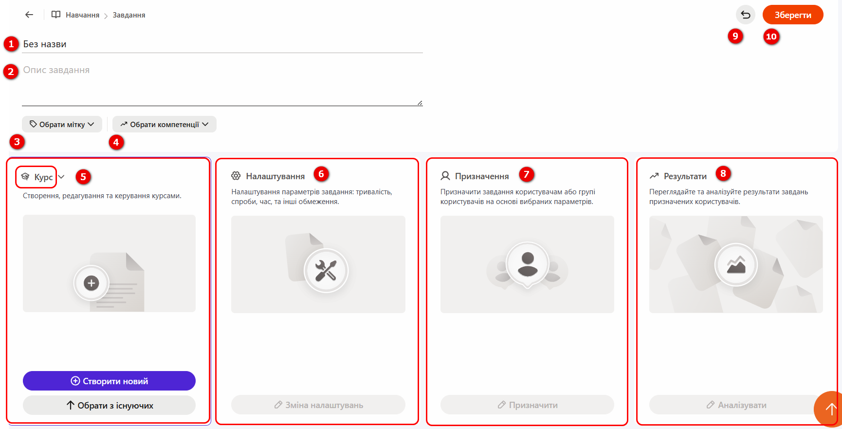 (4) - Обрати компетенції - за необхідності зазначити компетенції, які розвиває Курс. Детальніше: Використання компетенцій у завданнях.