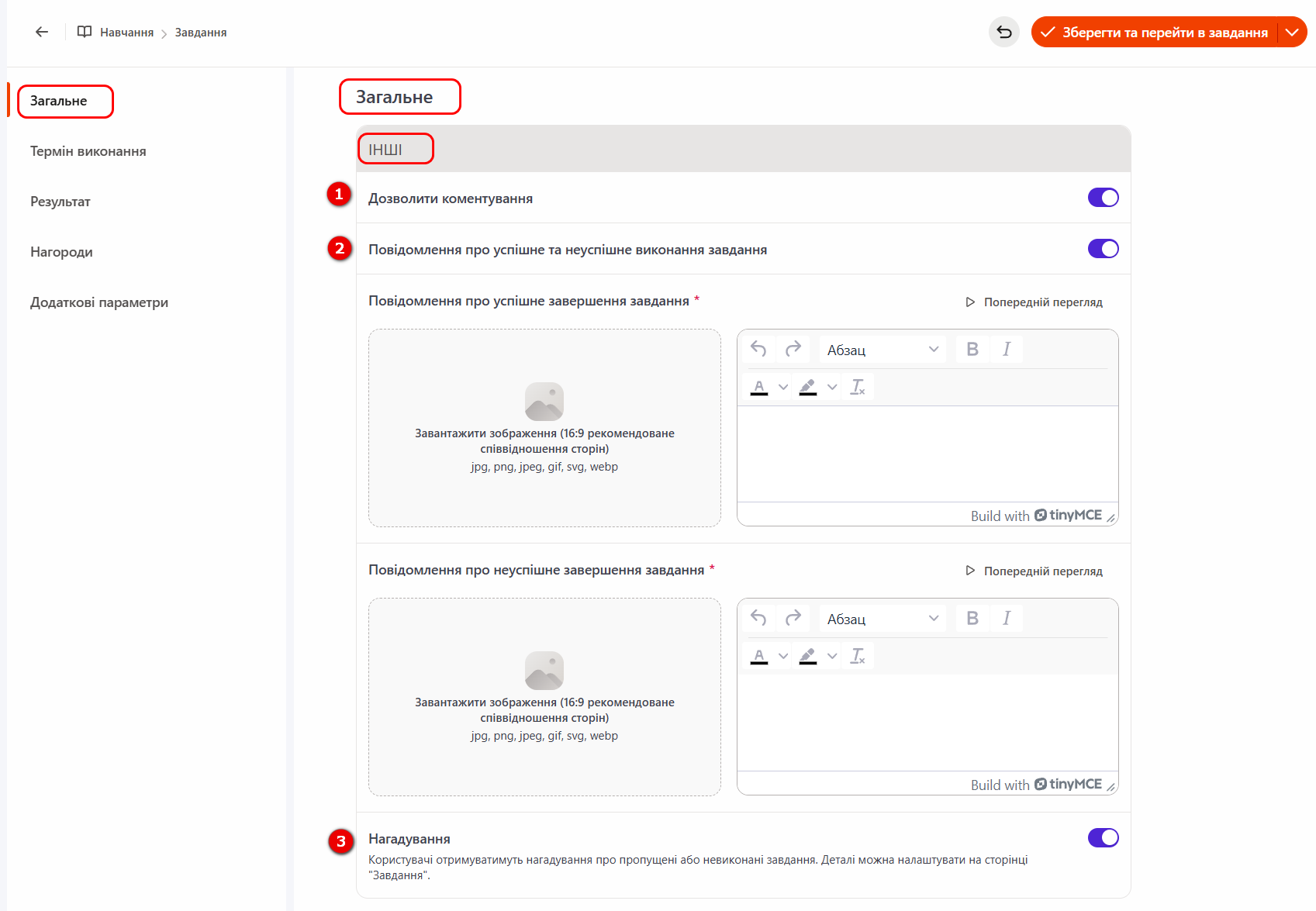 (2) - Повідомлення про успішне та неуспішне виконання завдання - можливість створити в редакторі власне повідомлення про успішне та неуспішне виконання завдання, а також додати зображення чи посилання до нього.