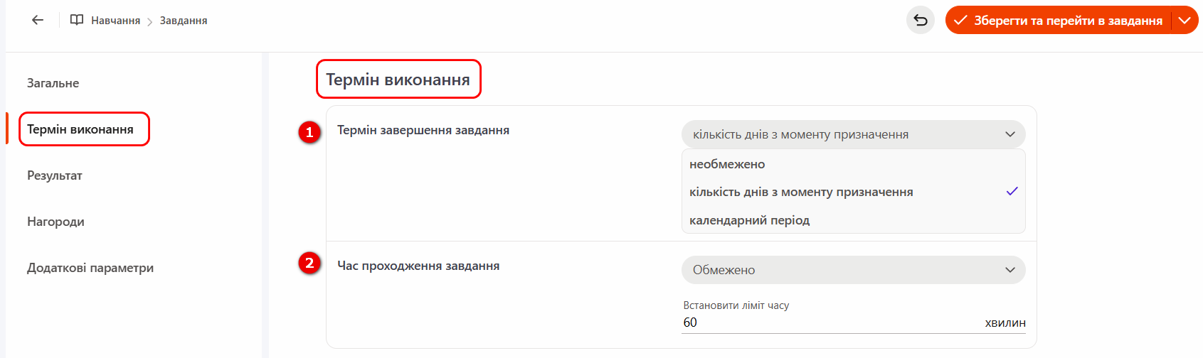 (1) - Термін завершення завдання - налаштування обмеження виконання завдання за часом (детальніше Термін виконання завдання). За замовчуванням встановлено Необмежений термін виконання.