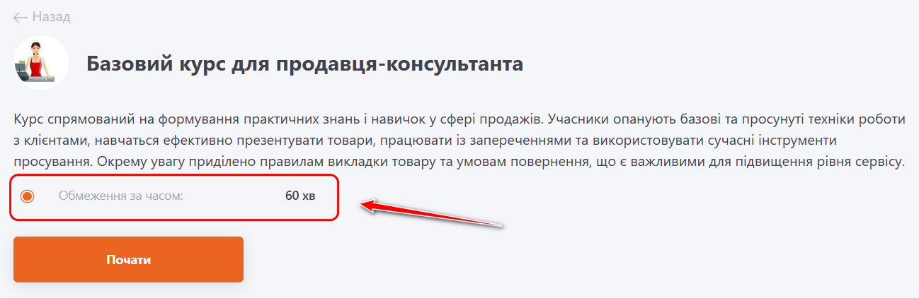 При обмежені часу прохождення Курса, на сторінці-прев'ю буде відображено інформацію про кількість часу, який відведено на проходження завдання: