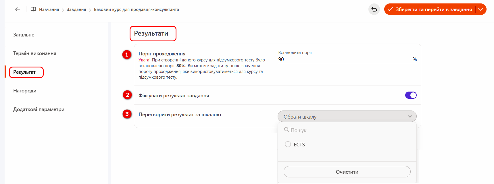 (3) - Перетворити результат за шкалою - можливість налаштувати перерахунок оцінки в % до потрібної шкали (наприклад, 5-бальна система, ECTS і т.д.). За замовчуванням усі завдання у системі оцінюються від 0 до 100%. Детальніше: Шкали оцінки завдань.