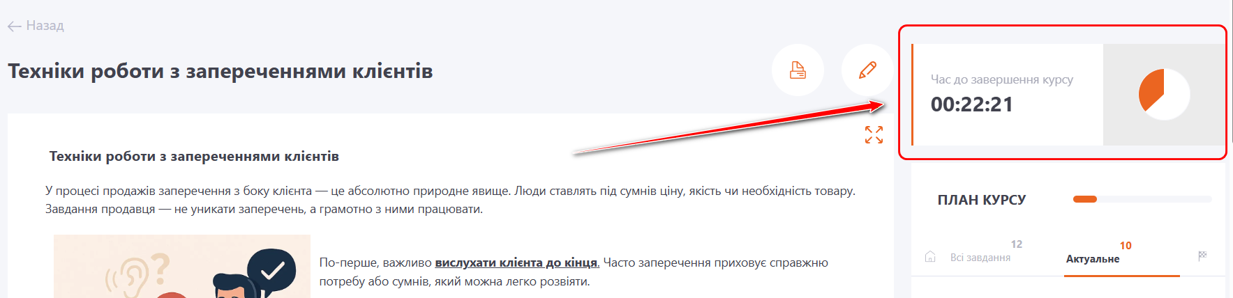 Також користувачу під час проходження Курса буде виводитись таймер: