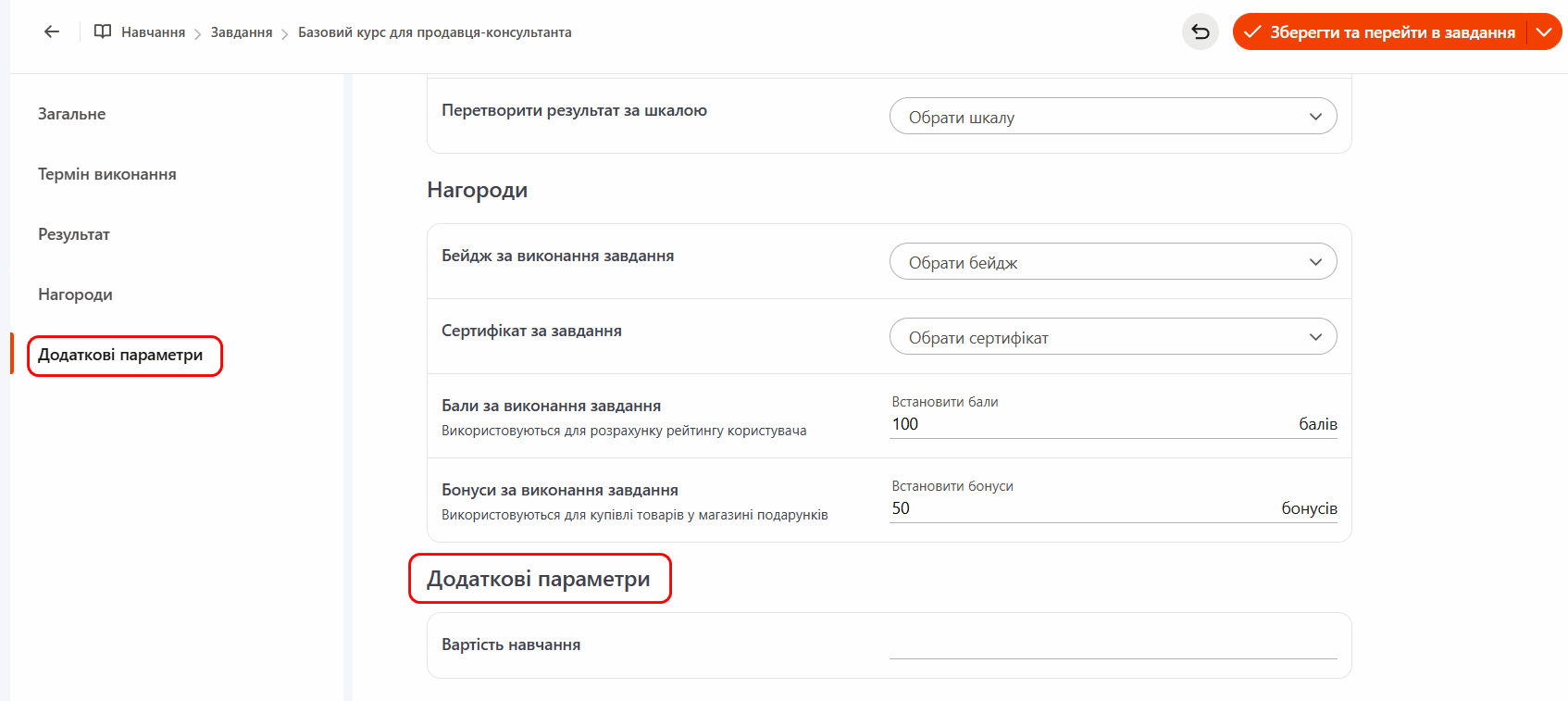 (3) - Бали за виконання завдання - вказати кількість балів за виконання завдання, які використовуються для розрахунку рейтинга користувача (докладніше Бали за виконання завдання);