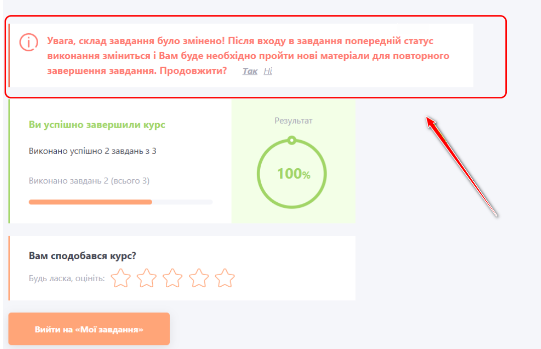 Якщо склад курсу було змінено, і користувач вирішить пройти його повторно, система повідомить, що при повторному вході в завдання статус виконання зміниться, і для отримання статусу «Виконано» необхідно пройти нові завдання.