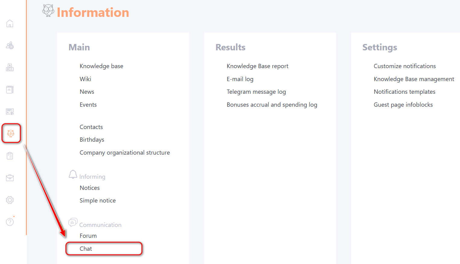 To configure the chat "Assistance", go to the menu Information - Chat