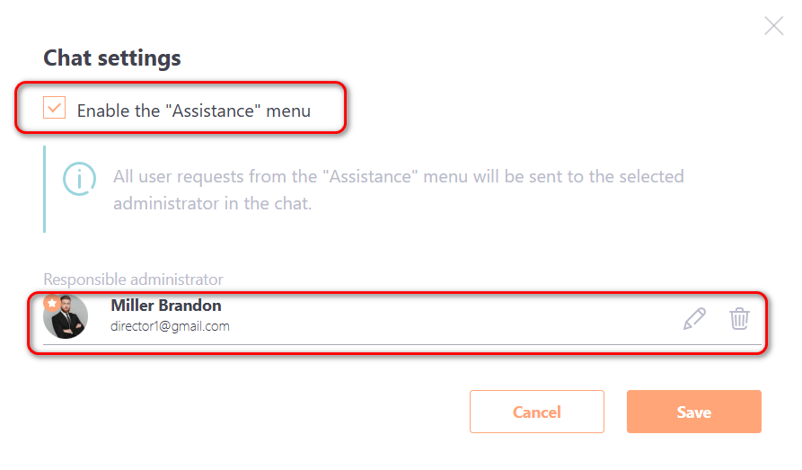In the modal window, you need to activate the "Enable the "Assistance" menu" option (check the checkbox), assign a responsible administrator who will process the request, and click the "Save" button.