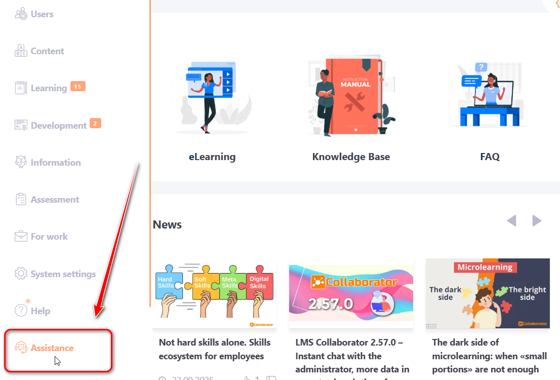 After saving the settings, the Assistance button will appear in the user menu.