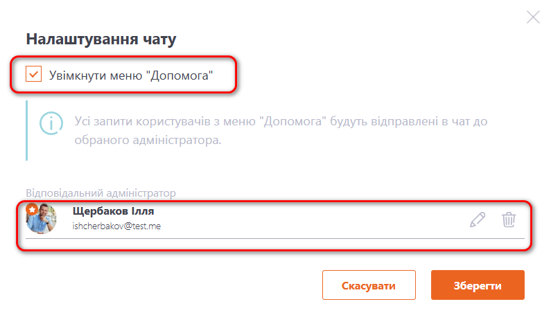У модальному вікні потрібно активувати опцію "Увімкнути меню Допомога" (встановити чекбокс), призначити відповідального адміністратора, який опрацьовуватиме звернення, та натиснути кнопку "Зберегти".