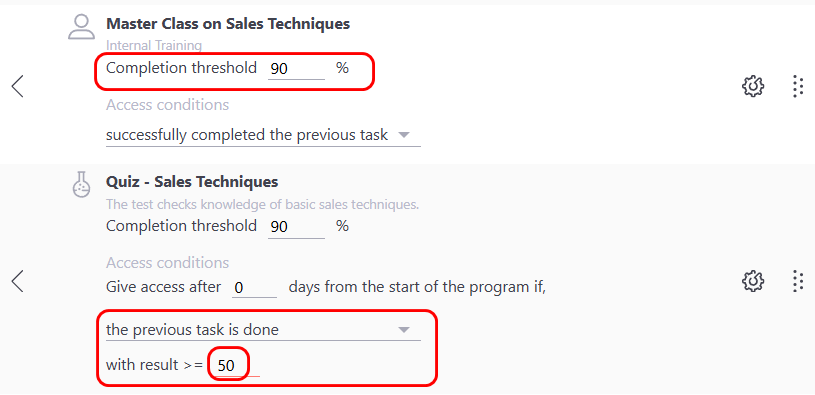 "Access condition – Previous task completed with a result of __%" means that the user must complete the previous task with a score higher than the specified percentage in the access conditions in the program on the previous task to unlock access to the next element.