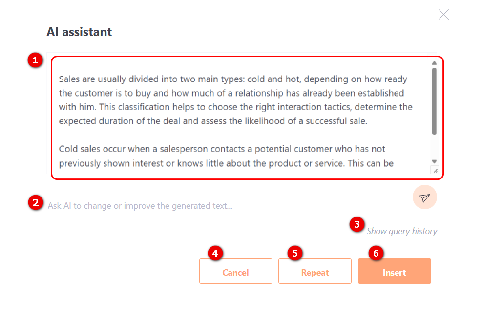 (1) – Generated text – in this field, you can view and edit the text generated by AI.