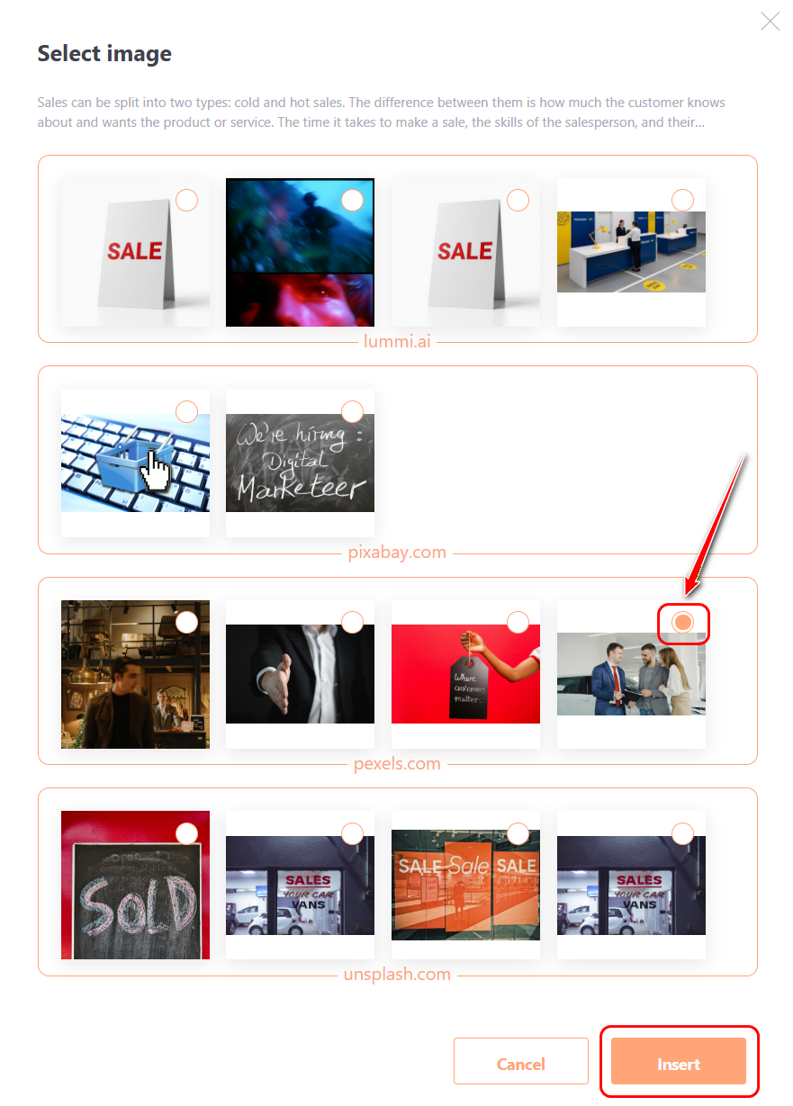 The AI will select images, which will open in a separate modal window. From the suggested options, choose the desired image and click the Insert button to add it to the resource page.