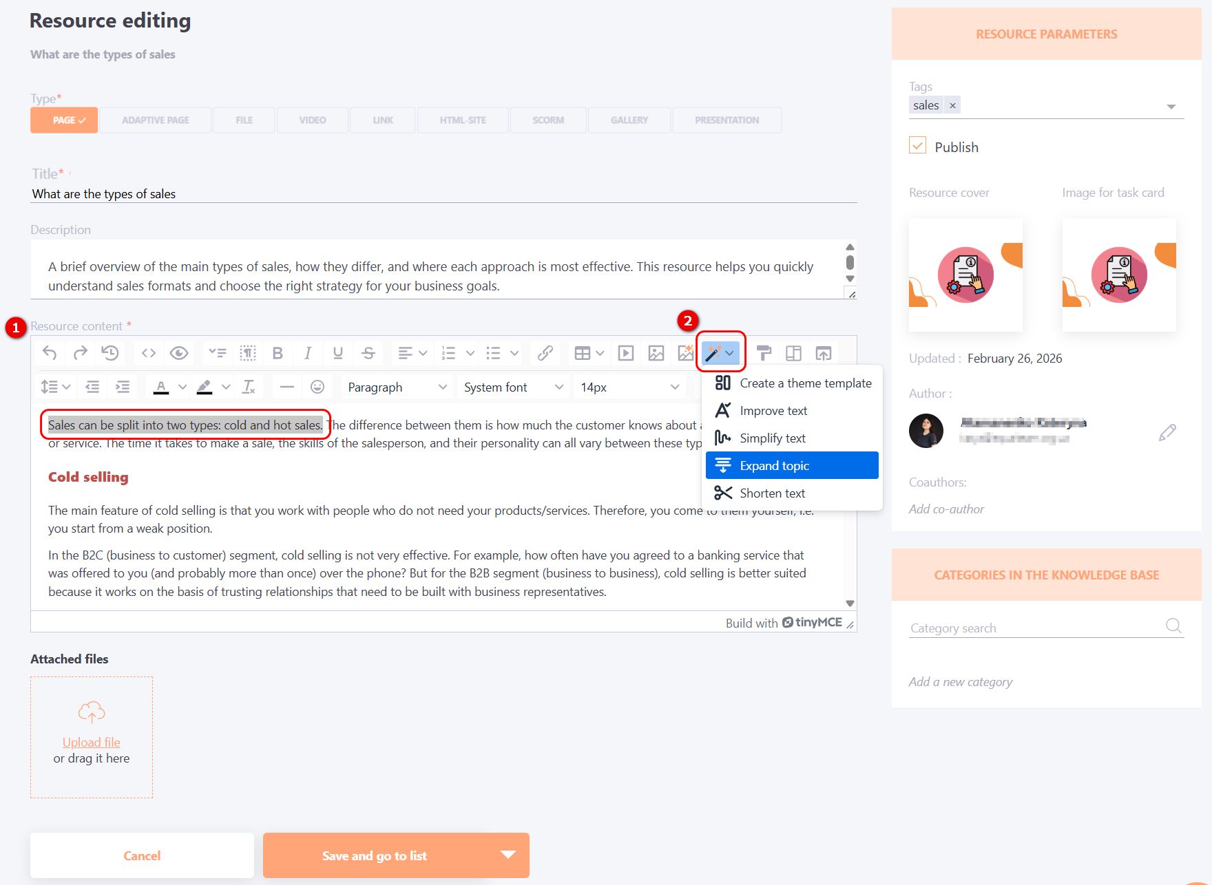 To do this, highlight the portion of text you want to modify in the Resource content (1) field and click the AI - Assistant (2) button.