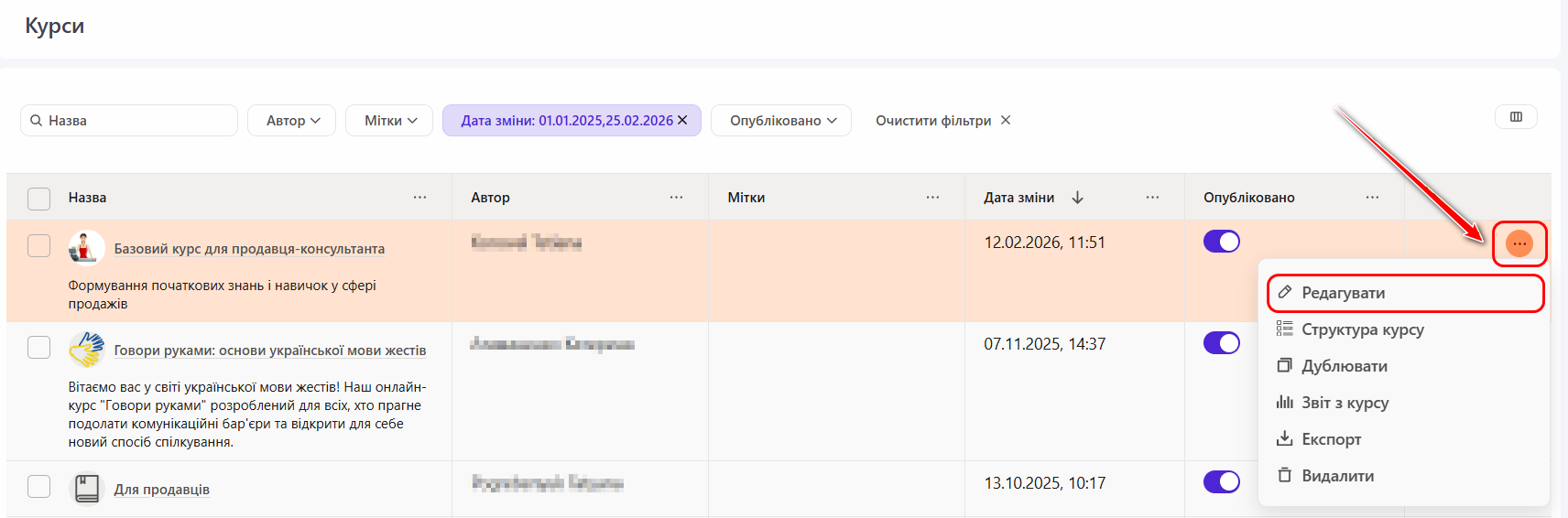 Після створення курсу будь-якої миті в нього можна внести зміни. Щоб перейти до сторінки редагування курсу, клацніть на іконку "олівець" навпроти потрібного курсу: