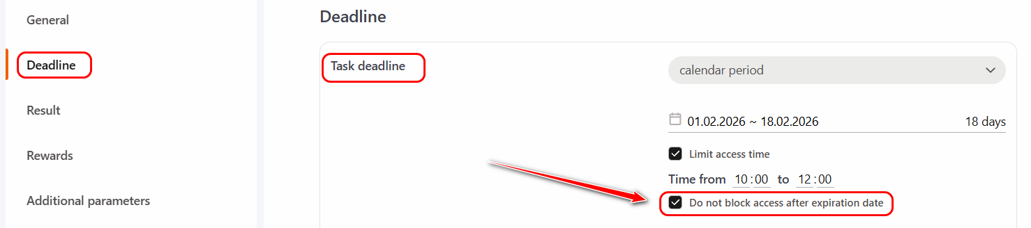 By default, the Do not block access after expiration date option is added to the task with a limited deadline.