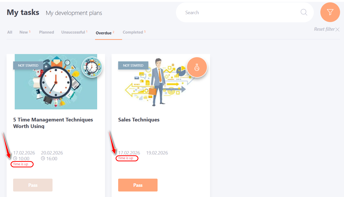 Such tasks for the user are available for completion in the Overdue tab, but the text Time is up will be displayed.