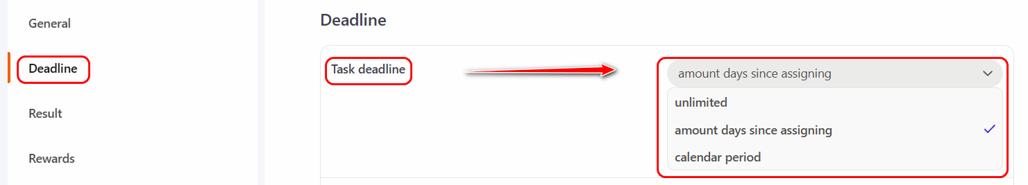Amount days since assigning — limits the completion time by the specified number of days from the moment the task is assigned to the user.