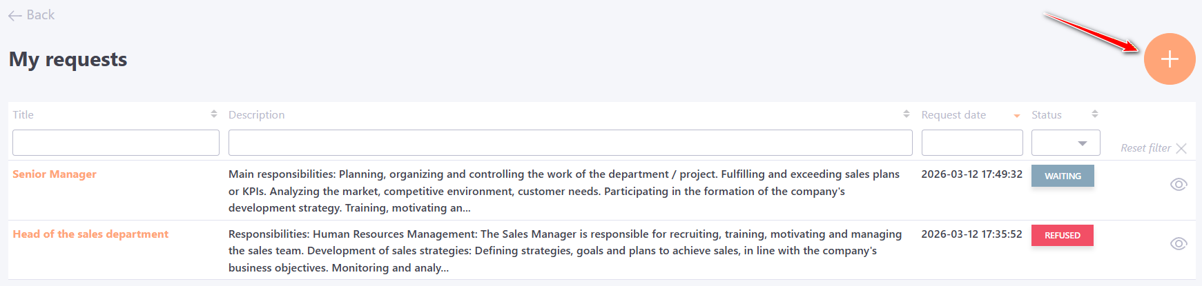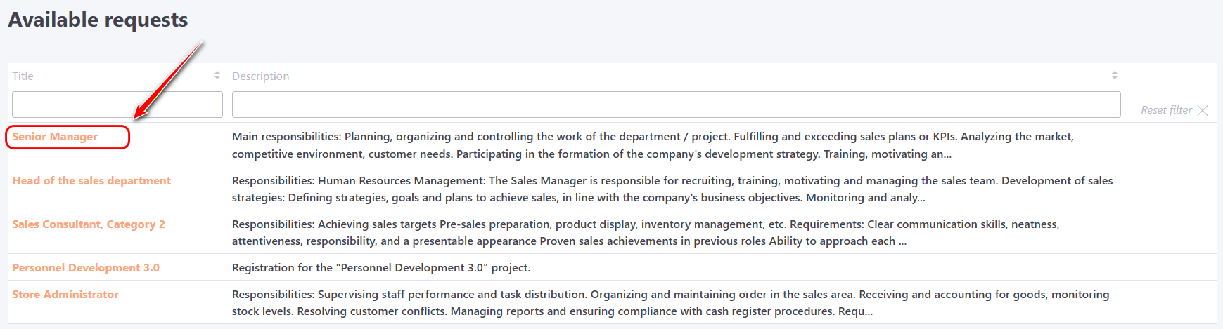 After clicking on the Apply request button, the page of all available requests is displayed.The employee needs to select the required request from the list and click on its title to go to the request filling page.