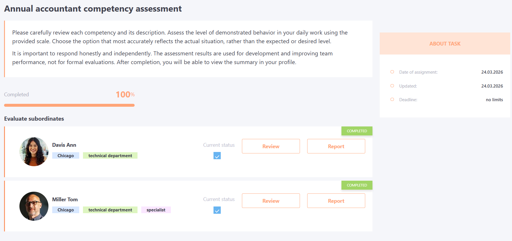 After the manager completes the questionnaire, the Review and Report buttons will be available on the task page. By clicking the Review button, the manager can review the responses provided to them.