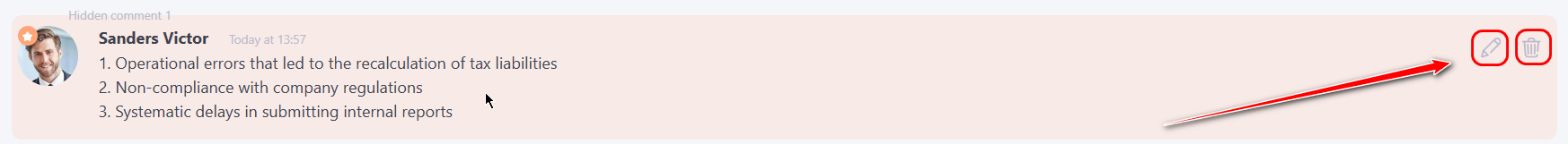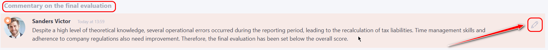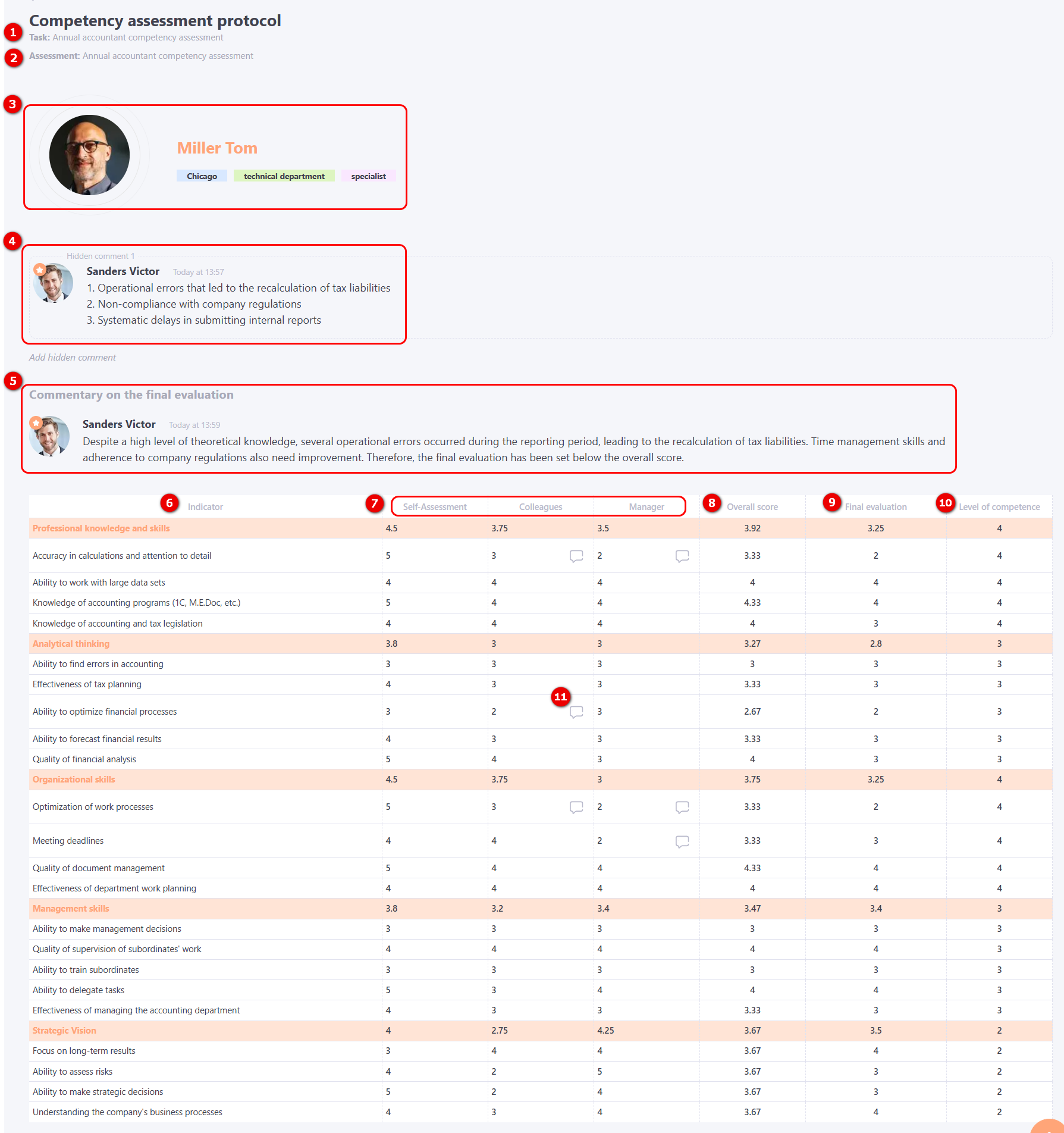 (4) – Hidden comment – this field is visible to the manager and administrator if the "Add final evaluation" option is enabled. It is intended for internal notes regarding the subordinate’s assessment results and is not visible to the user. Filling in the field is not mandatory. When hovering over the text, editing and deletion functions become available.