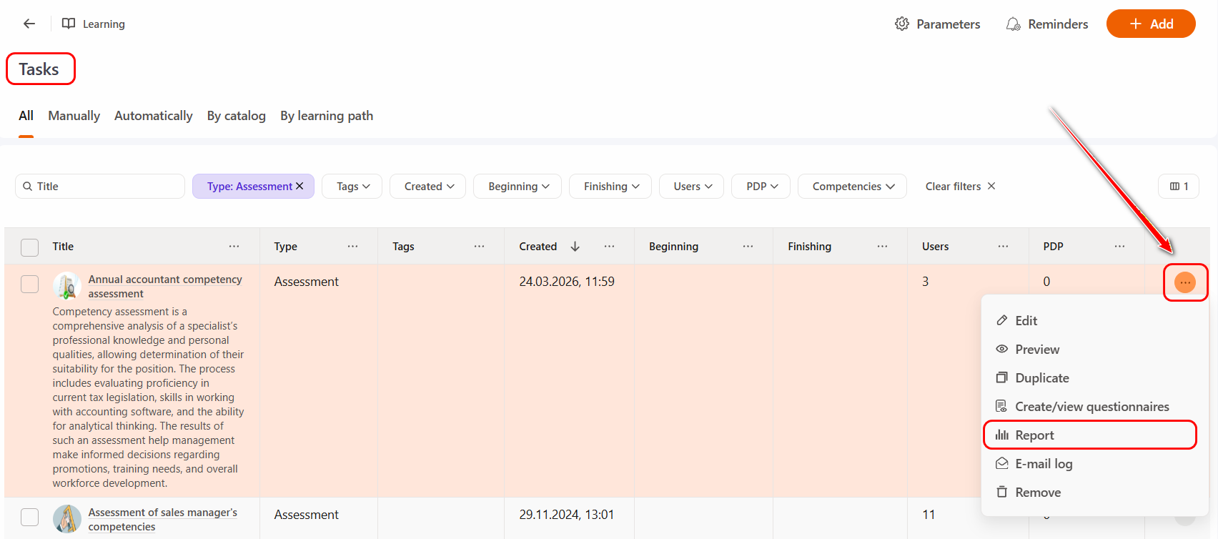 - On the Tasks page, click the Actions button - Report opposite the required task: