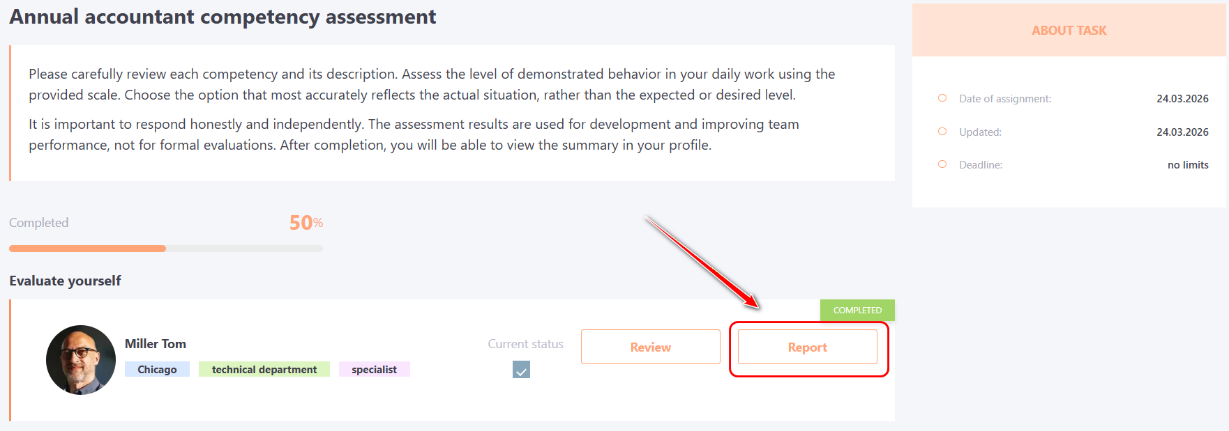 On the Assessment Report page you can view information about the status of completing the questionnaires and also display Competency assessment protocols by clicking on the button:
