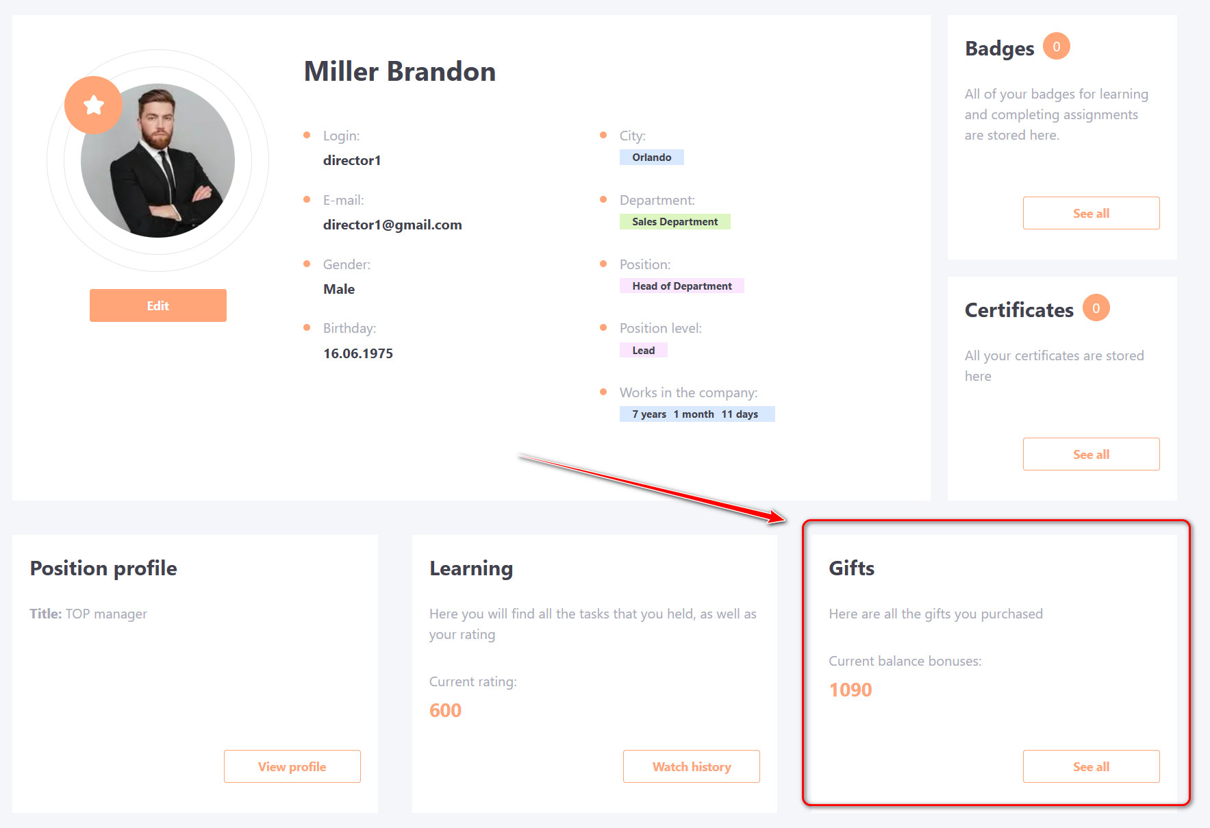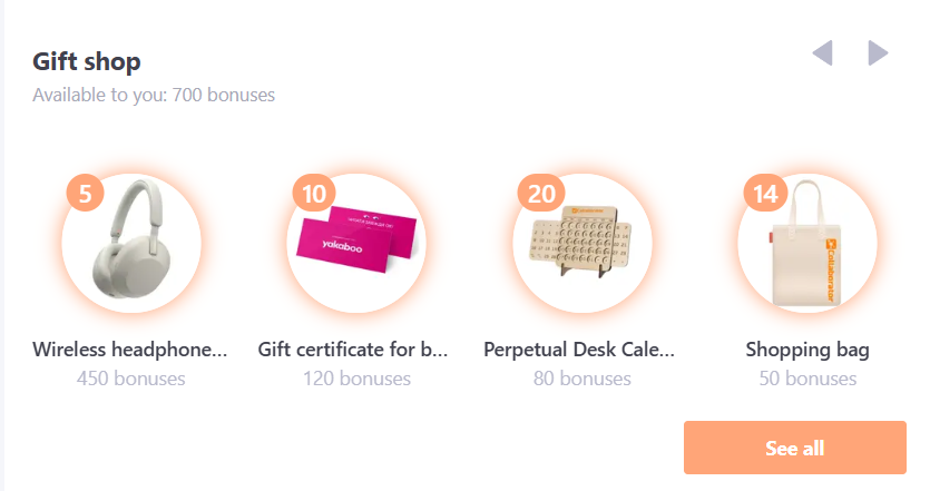 The current balance of bonuses is displayed in the user's profile and by clicking on the See all button, the gift shop page opens with the Purchased filter selected. To view all gifts, select the All tab.